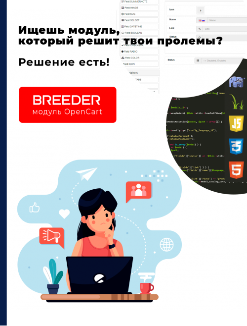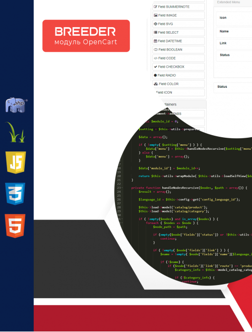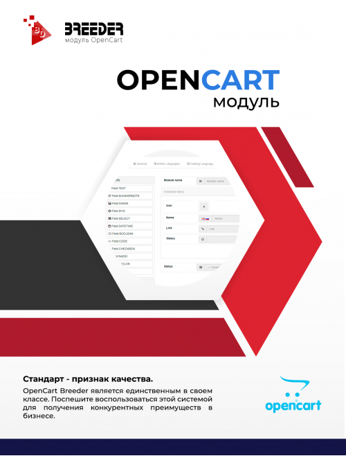 С помощью OpenCart Breeder вы без проблем, рутины и ошибок сконструируете административную часть ваших модулей неограниченной сложности. Вам останется реализовать только бизнес логику вашей разработки.